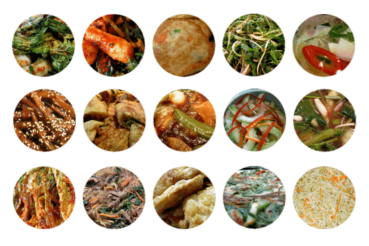반찬 banchan | Small Side Dishes A range of dishes eaten with rice to add flavor. The basic Korean meal consists of a bowl of rice, a