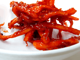 Spicy Seasoned Radish Strips. Made from fresh Korean radish (Mu) cut into strips and dried. Seasoned with red chili pepper powder, rice syrup, brown sugar, soy sauce, garlic, and sesame oil.