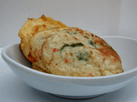 Egg Pancake is made from eggs, salt, carrot, onion, imitation crab, and green onions.
