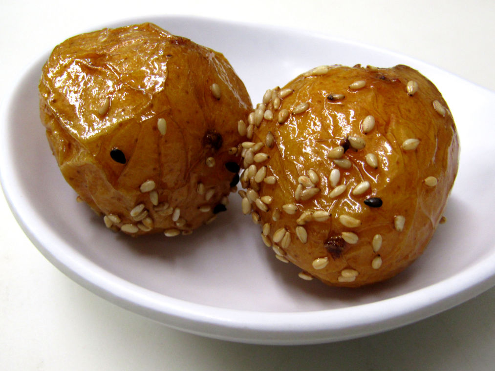 Braised small potatoes are made rom fresh potatoes, soy sauce, sesame oil, brown sugar, and corn syrup.