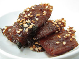 Made from burdock root, soy sauce, rice syrup, brown sugar, sesame oil, garlic, and sesame seed.