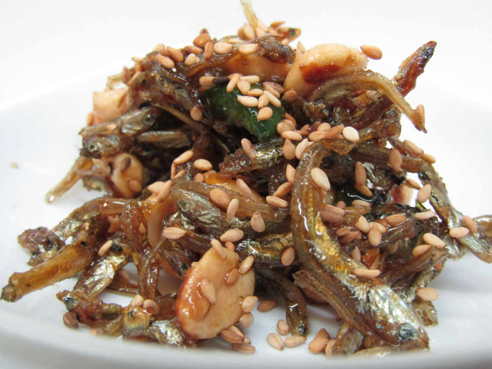 Stir fried Anchovy dish made from anchovies, rice or corn syrup, sesame oil, soy sauce, sugar, sesame seed, and crushed peanut, walnut, or pecan.
