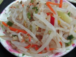Mung bean sprout salad is made from fresh mung bean sprouts, green onion, sesame oil, salt, and sesame seed. A second version is made from mung bean sprouts, green onion, carrot, salt, and sesame seeds.