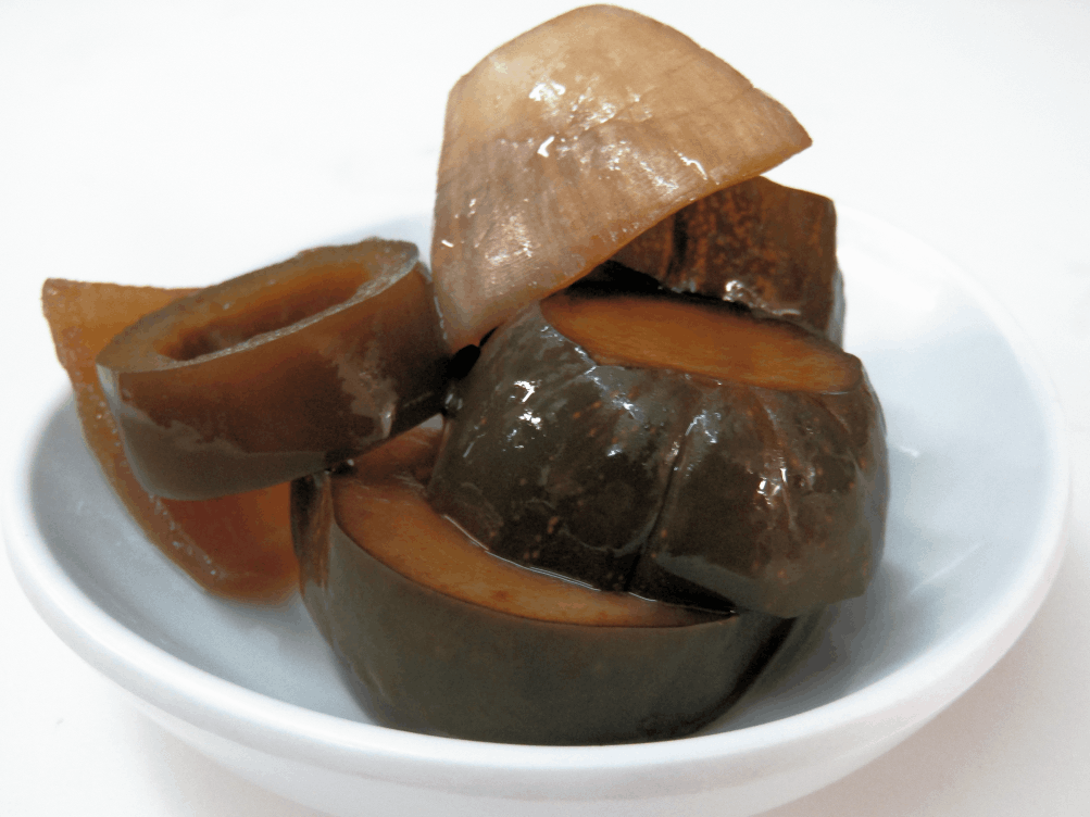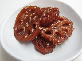 Candied lotus root made with sliced lotus root, soy sauce, sesame oil, rice or corn syrup, brown sugar, garlic, water, and vinegar.