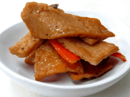 Stir fried fishcake (flour and ground fish) with carrot, hot green chili pepper, salt, soy sauce, corn syrup/rice syrup and/or sugar/brown sugar, sesame oil, garlic, and pepper.