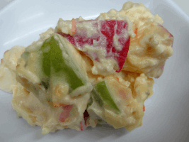 Gamja Saelleodeu is a Korean riff on the American Potato Salad. Made from potatoes, apples, carrot, onion, garlic, egg, cucumber, and dressing.