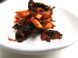 This spice candied dried squid dish is made in house from dried squid strips, sugar/brown sugar and/or rice syrup, ground red chili pepper. salt, sesame oil, and garlic. Available a few times a year.