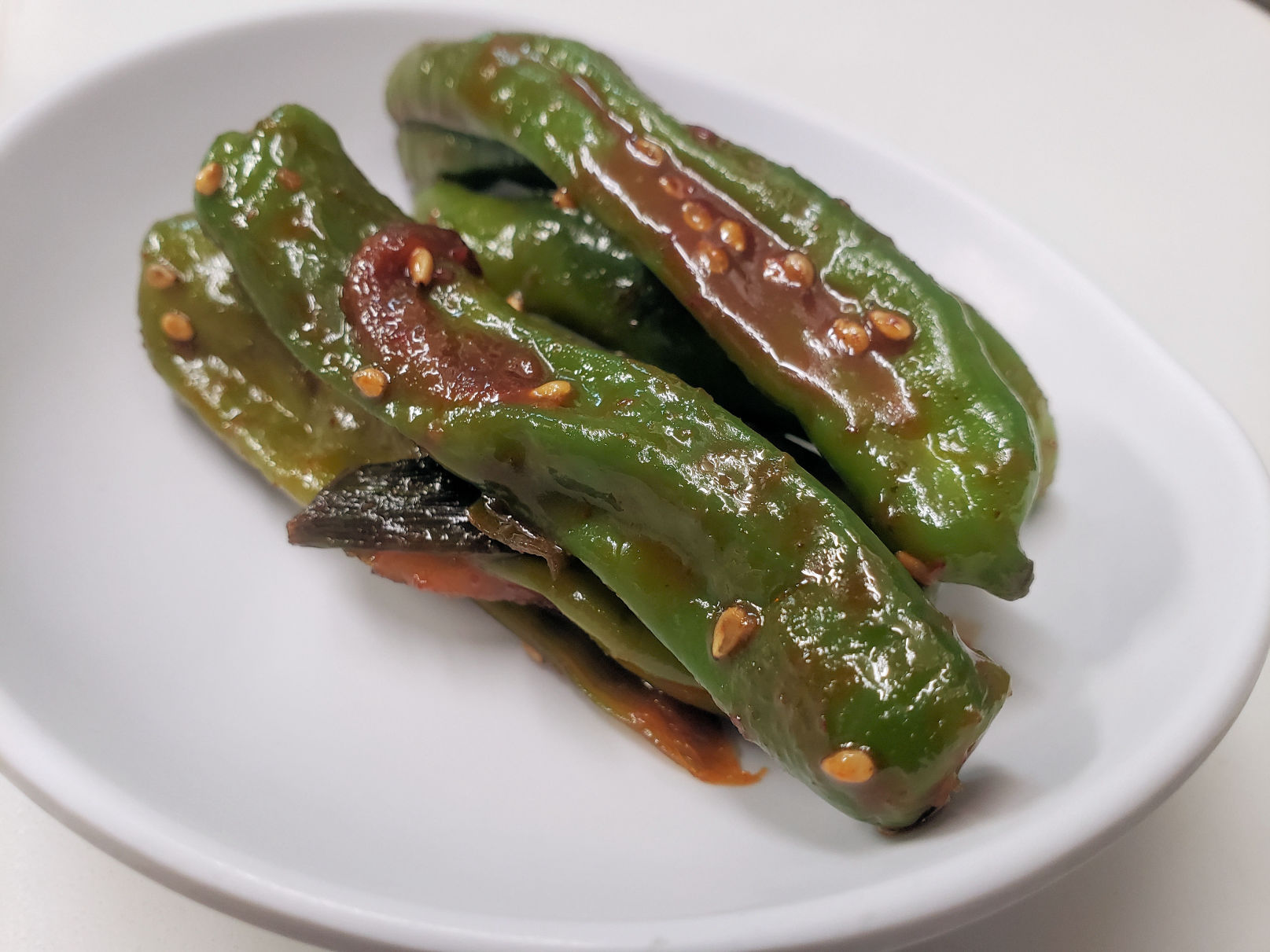 Stir fried pepper dish made with shishito peppers, gochujang (chili pepper paste) green onion, garlic, and honey.