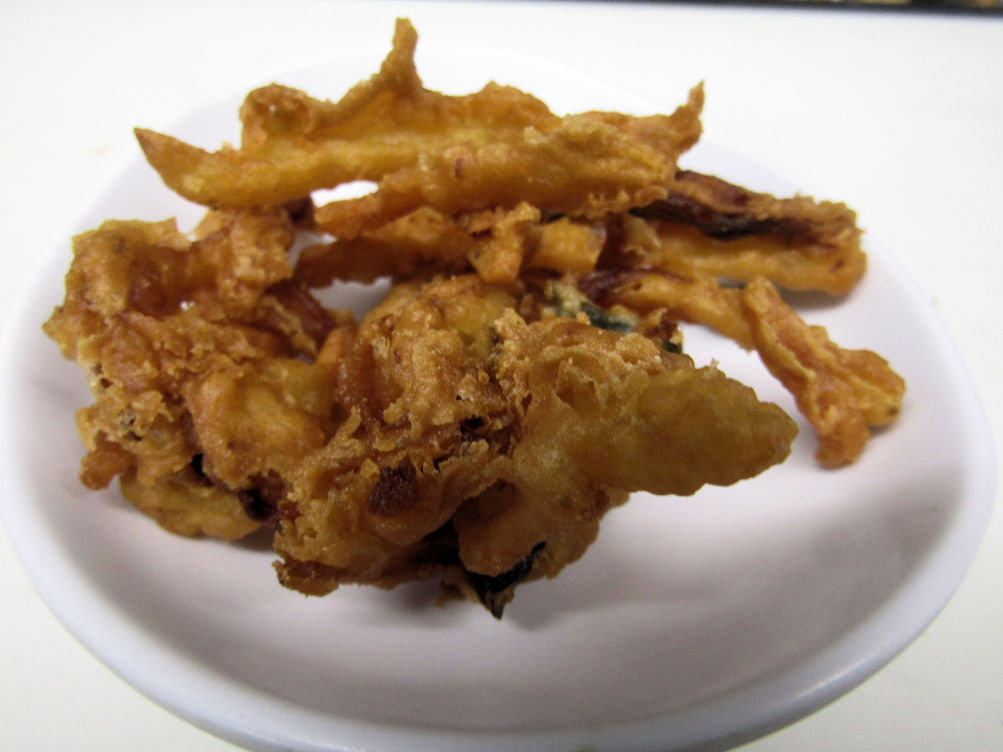 Battered and Fried Vegetables. Made from assorted vegetables (may include any of; carrot, onion, green onion, zucchini, potato, cabbage, garlic, chives, and sometimes others).