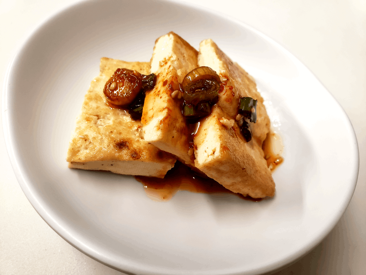Dubu (soybean curd / tofu) sliced into flat pieces and pan-fried.