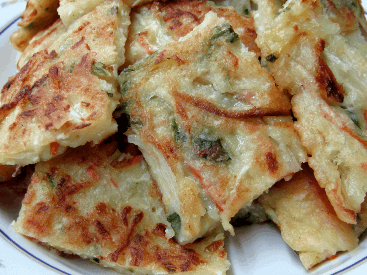 Pancakes made of an egg, wheat flour and rice flour batter pan-fried with green onions, and chives. Often may include any of: beef, clams, mussels, shrimp, mushrooms, and other ingredients.