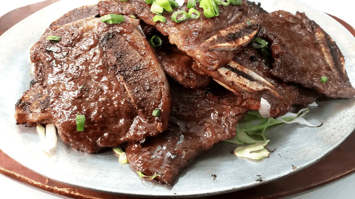 Beef short ribs marinated in a mixture of soy sauce, green onions, garlic, black pepper, sugar and