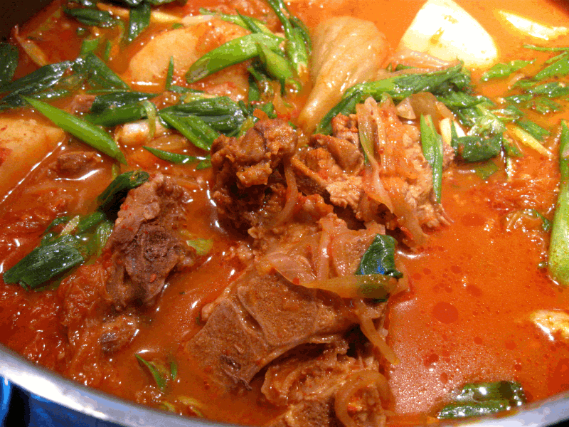A spicy soup made from pork neckbones, and often includes potatoes, daengmyeon, dried radish greens, perilla leaves, green onions, and hot peppers, and some versions use sour kimchi.