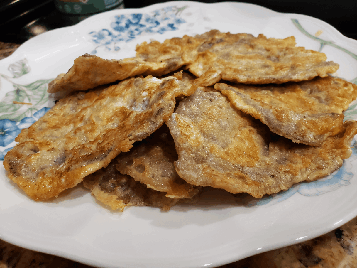 Thin slices of beef dusted in a starch or flour, dredged in egg batter, and pan fried.