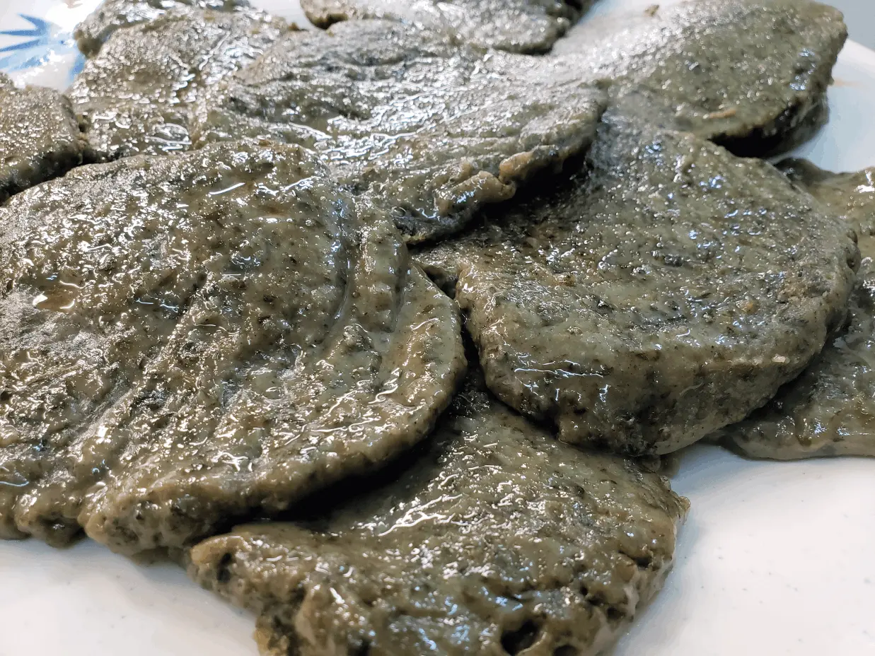 Dark green rice cakes made of rice flour and either powdered or fine minced mugwort. Mugwort can also be added to buckwheat, barley or sweet potato starch to make similar cakes.