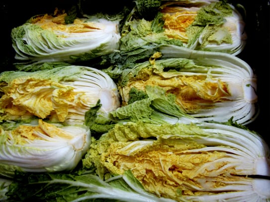 Baechu Kimchi (Korean Cabbage, Napa Cabbage, or Chinese Cabbage Kimchi) is probably the most common type of kimchi. This kimchi is made with whole or halved heads of Korean cabbage instead of the cut cabbage seen in many restaurants. The elongated heads have a semi sweet flavor that goes well with ginger, garlic, and dried red chili peppers.