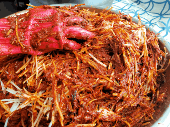 Add the seasoning paste to the Daikon/Green Onion/Chives and mix well.