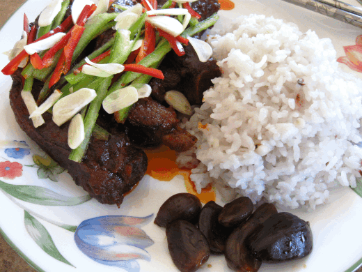Garnish the ribs and serve with steamed rice and banchan.