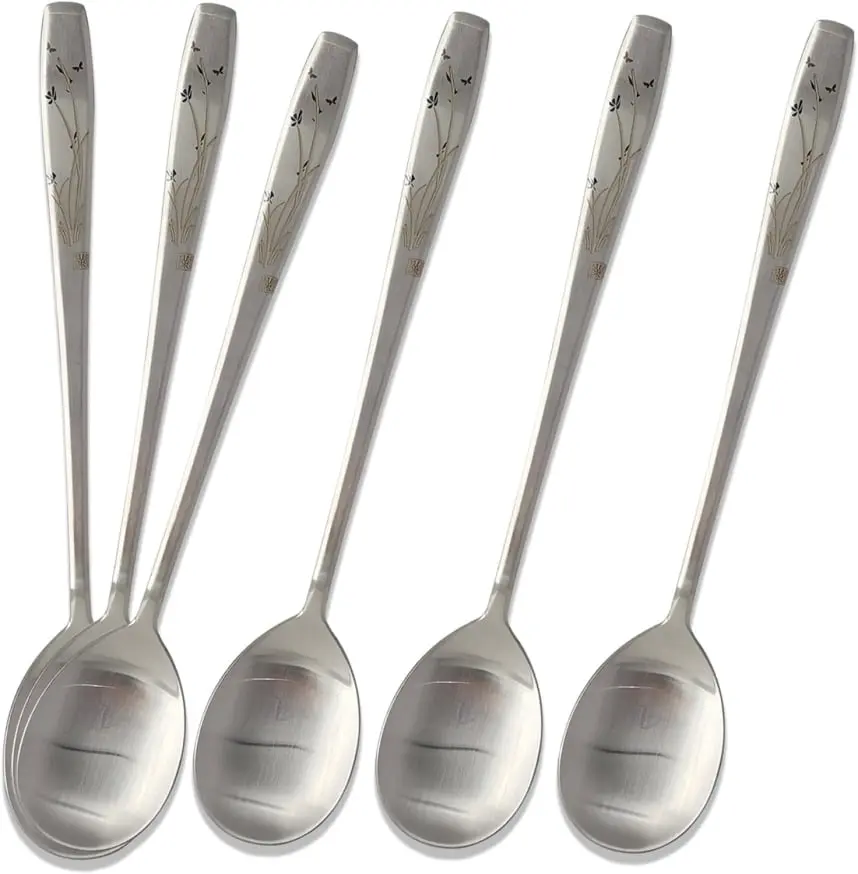 The smooth satin finish and laser etched designs on the handles make these spoons not only functional but also visually appealing. Perfect for a variety of dishes, these spoons have the ideal depth to hold just the right amount of food without spilling. Whether you're enjoying traditional Korean cuisine or any other meal, these spoons are designed to enhance your dining experience.