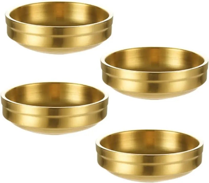These gold toned dishes provide an attractive setting for colorful Korean banchan. The double hulled design holds temperatures better than simple flat dishes.