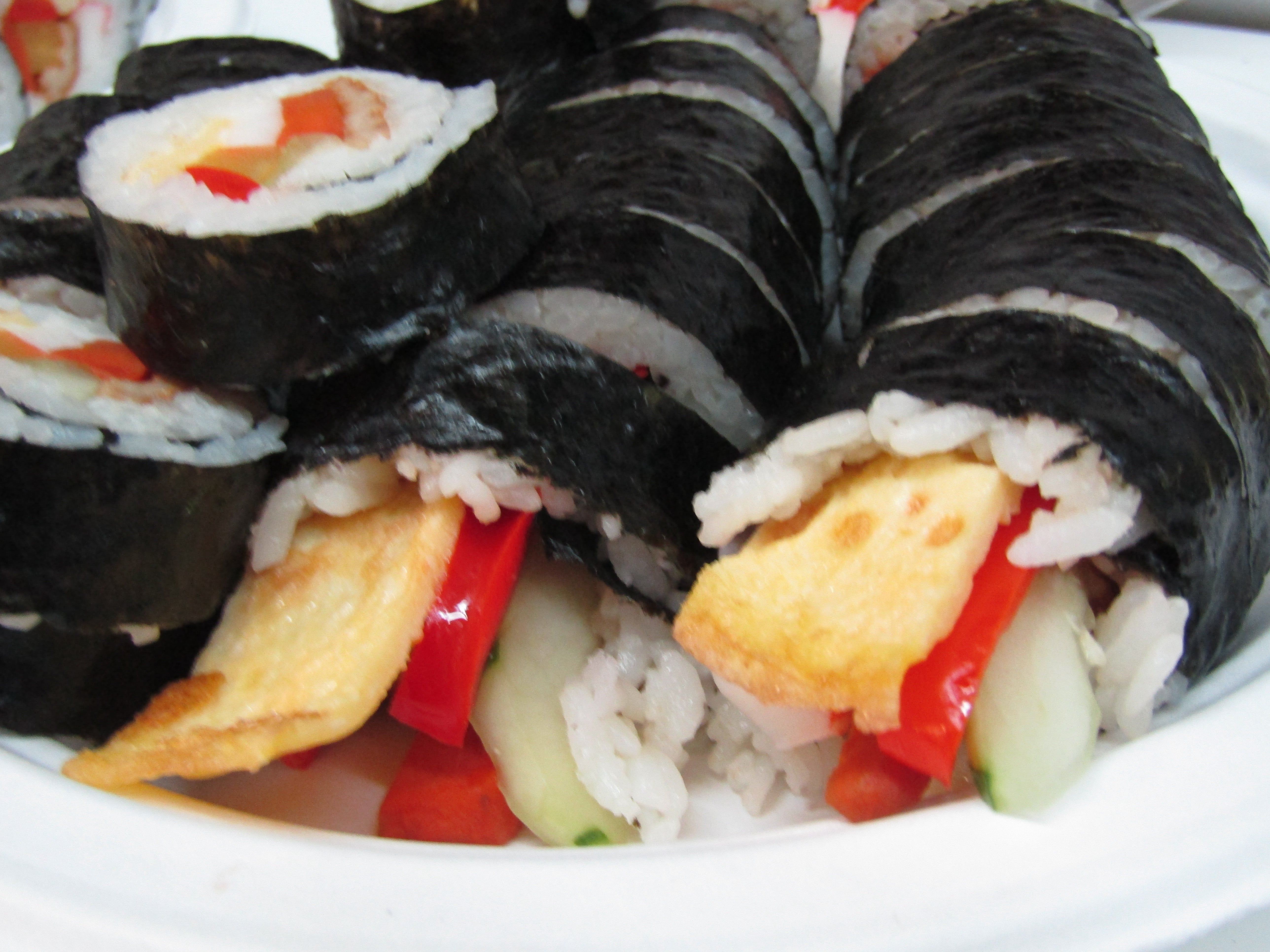 In Korean cuisine, kimbap is made of seaweed, rice, and various other ingredients formed into a roll, and then sliced and served. It's a great road trip food, as well as finger food for parties, game days, picnics, and more. Kimbap/Gimbap is a dish in which you can include almost anything, as long as it works for you. You can even go fusion and use tortilla instead of seaweed.